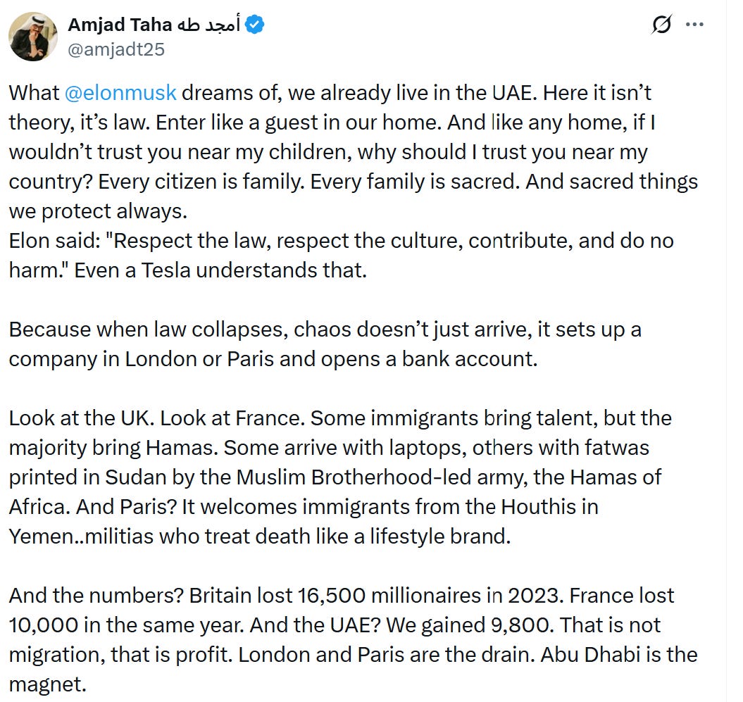 Posting on X, Mr. Taha said, “Chaos doesn’t just arrive; it sets up a company in London or Paris and opens a bank account. Look at the UK. Look at France. Some immigrants bring talent, but the majority bring Hamas…fatwas printed in Sudan by the Muslim Brotherhood-led army, the Hamas of Africa. And Paris? It welcomes immigrants from the Houthis in Yemen militia who treat death like a lifestyle brand.”